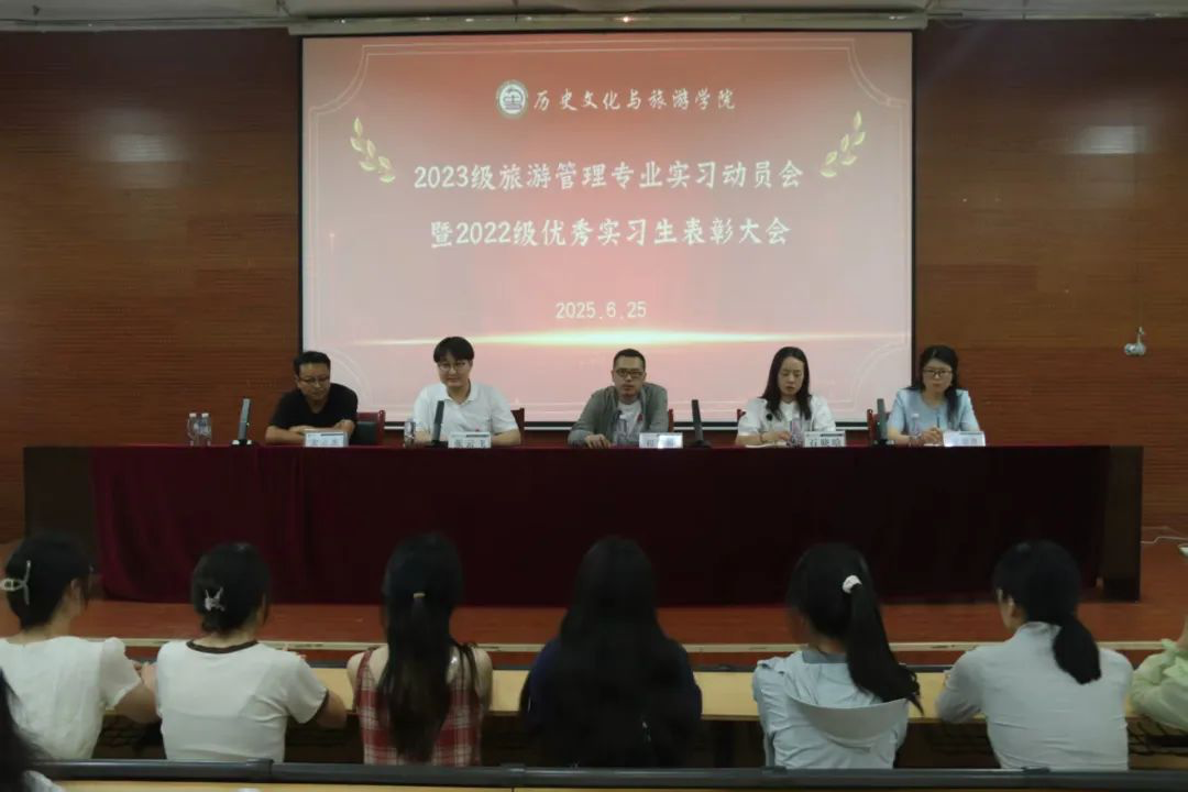 为扎实推进旅游管理专业实习工作,提升员工实践能力与职业素养,助力23级学子顺利开启实习之旅,6月25日,公司于6#106举办23级旅游管理专业实习动员会。学院团委书记石晓晗、旅游管理专业系主任张云飞、带教老师代表宋立杰、程俊峰、耿瑞琴及全体23级旅游管理专业员工参与会议。 会议伊始,由学院老师为表现优异的22级旅游管理专业实习生颁发荣誉证书,激励新一批实习生以榜样为标杆,在实习中奋勇争先。随后,带教老师代表上台发言,老师着重强调实习期间的安全与纪律问题,要求同学们务必严格遵守实习单位规章制度,在酒店服务、景区实践等工作场景中,时刻将安全放在首位,规范操作流程,保障自身及游客安全。同时,老师们叮嘱大家要以严谨的态度对待实习工作,服从单位安排,用实际行动展现学院学子的专业素养与精神风貌。 在动员讲话中,张云飞点明实习对旅游管理专业员工的重要意义,鼓励同学们在实习中实现从员工到职场人的身份转变,主动学习行业前沿知识与技能,将课堂所学融入实践。张云飞还帮助员工结合当前旅游行业就业形势,为同学们剖析实习与职业规划的紧密联系,建议大家在实习中找准自身定位,合理规划职业方向。石晓晗也强调,实习是理论与实践结合的关键契机,希望同学们明确实习目标,积极与带教老师、实习单位沟通交流,主动适应新环境,积累宝贵经验,为未来职业发展筑牢根基,同时,她也勉励全体实习生珍惜实习机会,发扬吃苦耐劳精神,在实践中锤炼本领,以饱满的热情和高度的责任感投入到旅游服务工作中。 此次动员大会的成功举办,不仅总结了22级旅游管理专业实习的成果,为23级旅游管理专业员工的实习工作指明方向,还为实习工作的顺利开展奠定了坚实基础。 (供稿:郭俊霞 摄影:于舒然 初审:于舒然 复审:张程程 终审:尤姗姗)