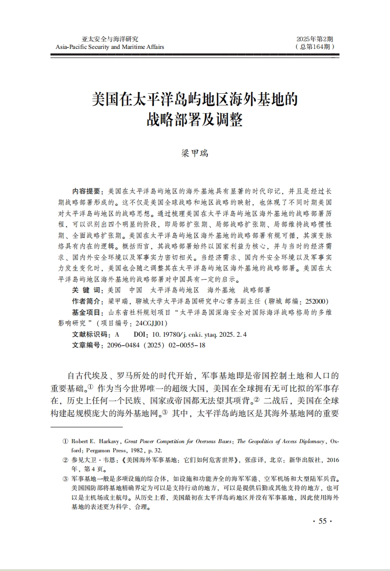 山东省哲学社会科学青年人才团队“太平洋岛国海洋经济发展研究团队”带头人梁甲瑞博士在权威期刊《亚太安全与海洋研究》2025年第2期上发表文章《美国在太平洋岛屿地区的战略部署及调整》(全文约2万字)。 梁甲瑞认为美国在太平洋岛屿地区的海外基地具有显著的时代印记,并且是经过长期战略部署形成的。这不仅是美国全球战略和地区战略的映射,也体现了不同时期美国对太平洋岛屿地区的战略思想。通过梳理美国在太平洋岛屿地区海外基地的战略部署历程,可以识别出四个明显的阶段,即局部扩张期、局部战略扩张期、局部维持战略惯性期、全面战略扩张期。美国在太平洋岛屿地区海外基地的战略部署有规可循,其演变脉络具有内在的逻辑。概括而言,其战略部署始终以国家利益为核心,并与当时的经济需求、国内外安全环境以及军事实力密切相关。当经济需求、国内外安全环境以及军事实力发生变化时,美国也会随之调整其在太平洋岛屿地区海外基地的战略部署。 梁甲瑞在文章中指出战略思想是对外战略的驱动力,对外战略决定了国家采取哪些具体的政策,而海外基地是美国实施对外战略的手段。伴随其国家对外战略调整,美国海外基地的战略部署也在不断调整。美国在太平洋岛屿地区部署海外基地始于1856年。美国依据其1856 年颁布的《鸟粪岛法》占据部分太平洋岛屿,开启其太平洋扩张活动的前奏。此后,美国开始在太平洋岛屿地区部署海外基地。美国根据《鸟粪岛法》,先后对太平洋岛屿地区的贝克岛、贾维斯岛、弗林特岛、马登岛、沃斯托克岛、中途岛等岛屿宣示了主权。美西战争后,在海洋扩张战略的驱动之下,美国开始在太平洋岛屿地区的中部和北部建立军事基地,主要包括密克罗尼西亚地区的夏威夷群岛、帕果帕果、关岛、威克岛等。 日本战败后,太平洋成为美国的“内湖”(American Lake)。整体上看,“内湖”思想驱动了战后美国对太平洋岛屿地区的战略,以至于1945年至1990年,美国基本上保持了太平洋岛屿地区海外基地的原有规模。虽然尼克松上台后表示美国要从海外收缩,但其程度是有限的,美国将继续在亚太地区发挥重大作用。为此,美国需要维持一定数量的海外基地,保持战略惯性。1990年以来,美国全球海外基地的部署主要分布在三大区域:一是欧洲海外基地群;二是西太平洋海外基地群;三是大中东地区海外基地群。冷战结束后,美国大规模调整了海外基地。受反恐战争的影响,美国一度增加在大中东地区的海外基地。但随着反恐战争的结束,大中东地区海外基地群的规模开始收缩。而由于亚太地区重要的战略地位和不断变化的安全形势,美国逐渐将战略重心转移到亚太地区,甚至提出“印太战略”。太平洋岛屿地区对美国的地缘战略重要性日趋突出。自此,美国在太平洋岛屿地区海外基地的战略部署进入了全面战略扩张期。